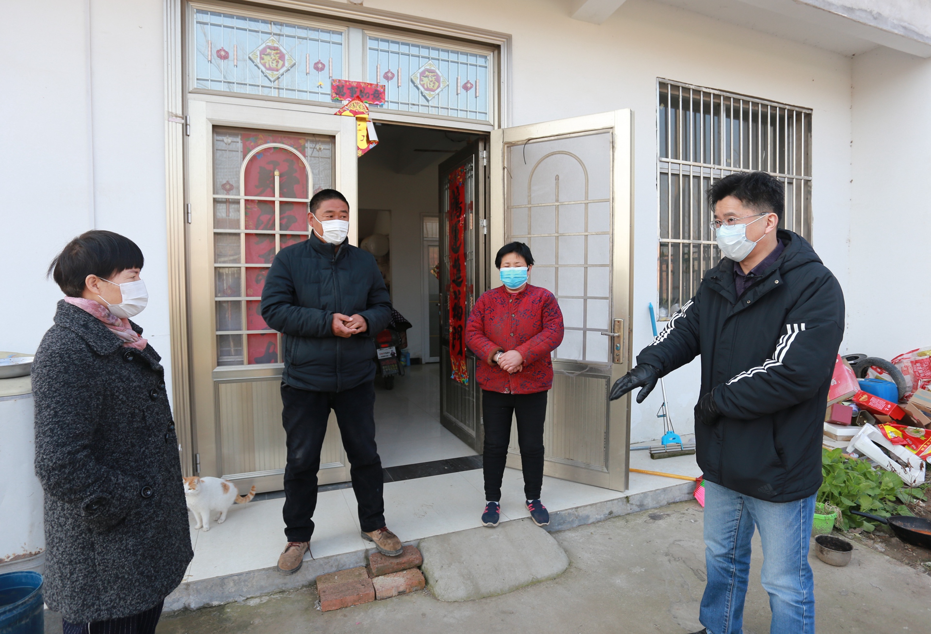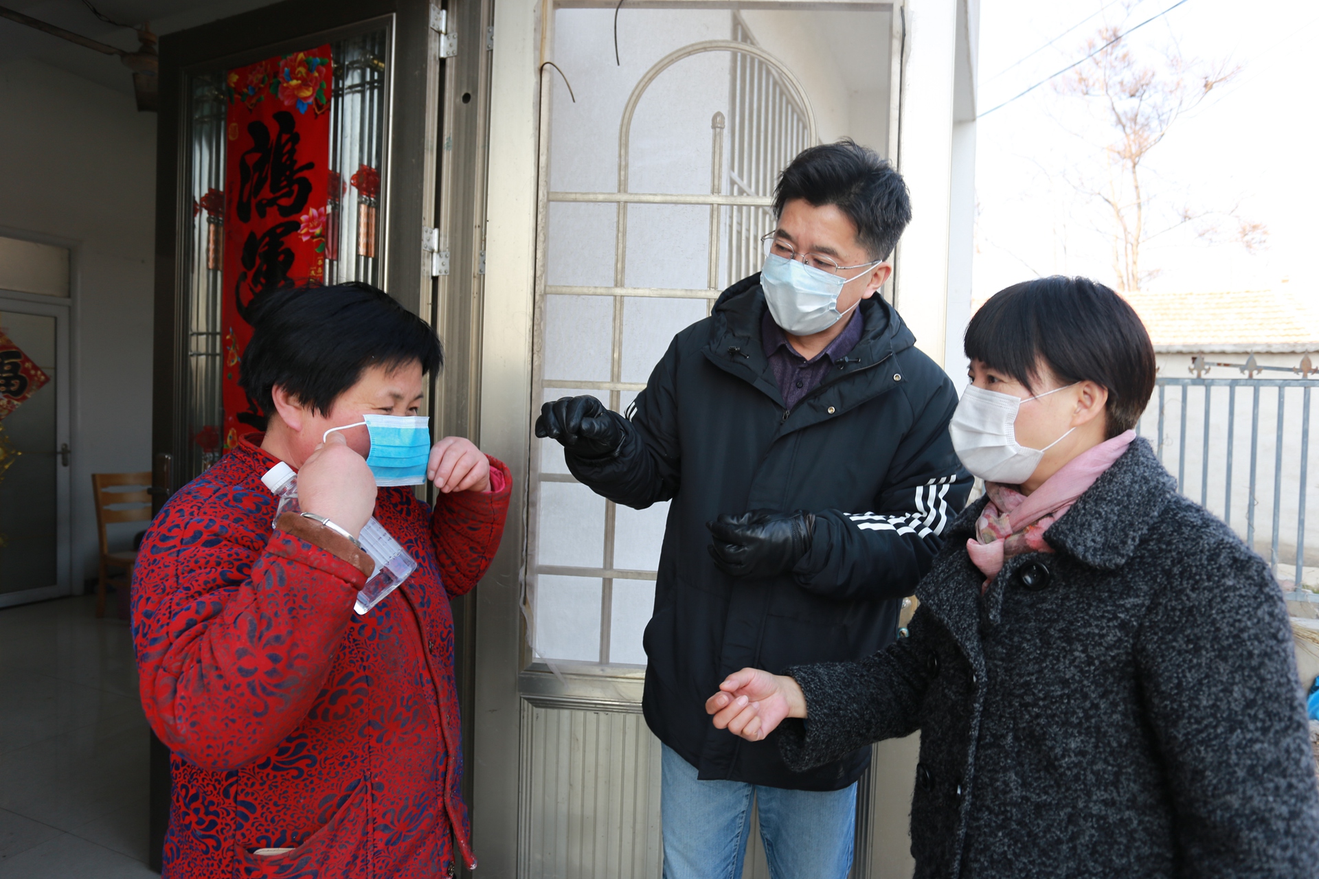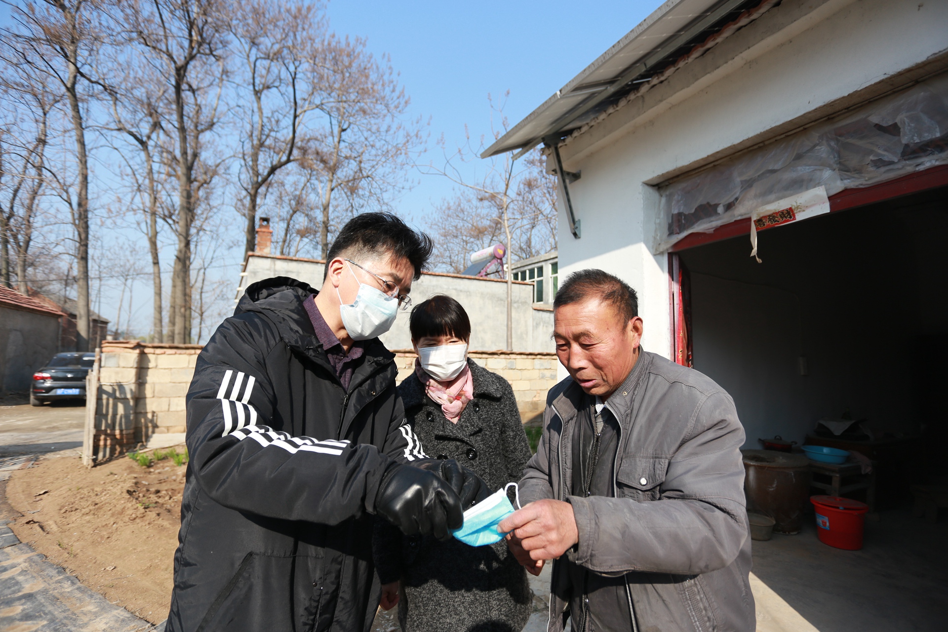 火神庙村黄庄村民黄传平双手颤颤巍巍地接过抗疫防护物资,开心地说:“我一个月就戴这一个口罩,没的换,现在好啦,有口罩戴啦。太谢谢你们送来口罩,酒精和消毒液,还有疫情防控知识,这是今年我收到的最好礼物!” 王献忠书记不仅给他们送来了口罩、酒精等抗疫防护物资,还耐心地为他们讲解口罩的佩戴方法和酒精的正确使用方法。