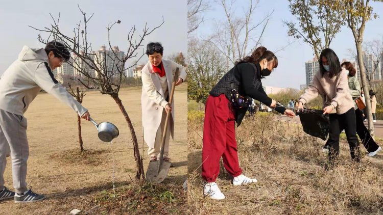 女职工们在公园内认真地清扫和拾捡地面及绿化带里的垃圾、杂物,为园区内的树木松土浇水,大家的志愿行动为淮北市民提供了干净整洁的休闲娱乐环境。