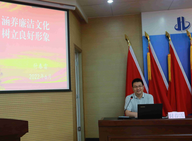 付春雷主任以“涵养廉洁文化,树立良好形象”为主题,从廉洁文化的变迁,廉洁文化建设的内涵等三个方面解读了廉洁文化建设的重要意义。付春雷结合自身学习领悟和长期工作实践,让大家深入了解廉洁的含义为:“一曰廉善,二曰廉能,三曰廉敬,四曰廉正,五曰廉法,六曰廉辨”。通过加强新时代廉洁文化建设,一体推进不敢腐、不能腐、不想腐,深化系统施治、标本兼治的重要举措。广大党员干部要守好清廉底线,用清廉为干事奠基,慎初慎微,勤政为民,在廉洁干事、廉洁成事中树立起新时代党员干部忠诚干净担当的良好形象。