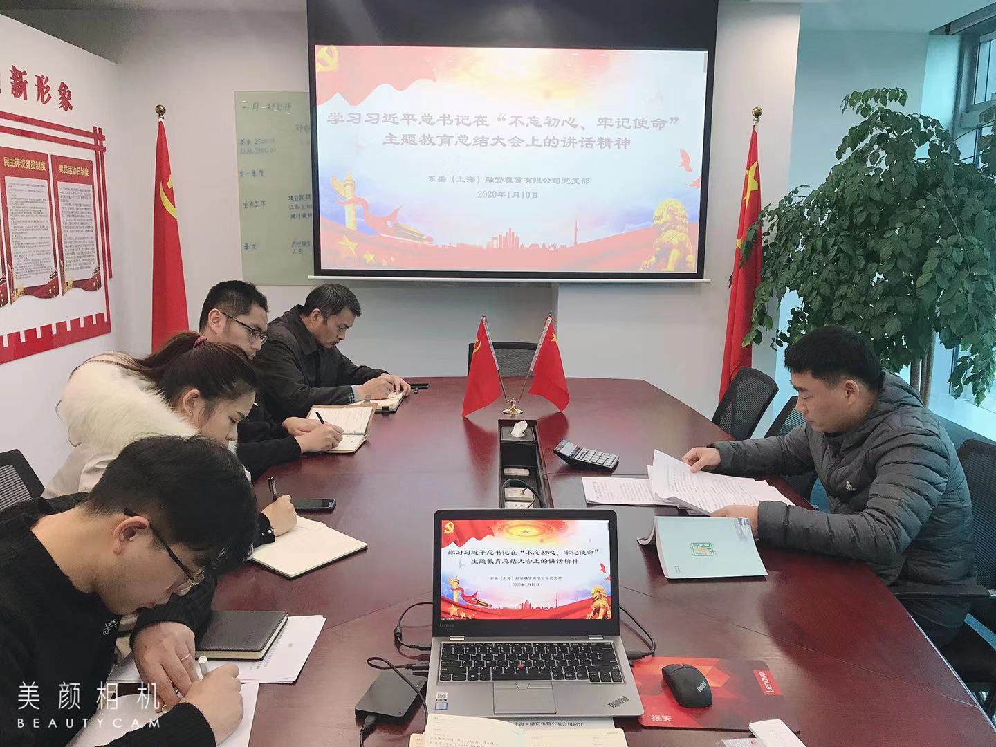 1月10日下午,东盛党支部在党员活动室开展了以“不忘初心、牢记使命”为主题的集中学习会议。会议传达学习了习近平总书记在“不忘初心、牢记使命”主题教育总结大会上的重要讲话精神并细细品味了习近平总书记在主题教育总结大会上的讲话金句。在集中学习重要讲话精神后,东盛支部观看了主题教育总结大会视频。