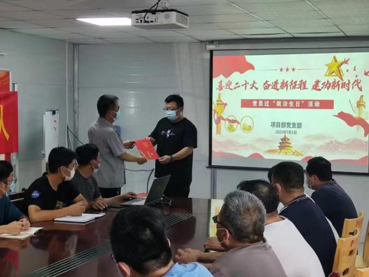 为庆祝中国共产党成立101周年,喜迎党的二十大,引导党员干部进一步坚定理想信念、牢记初心使命,7月1日上午,淮海建工公司项目部党支部开展“为党旗添彩,为党徽增光”主题党日暨党员过政治生日活动。