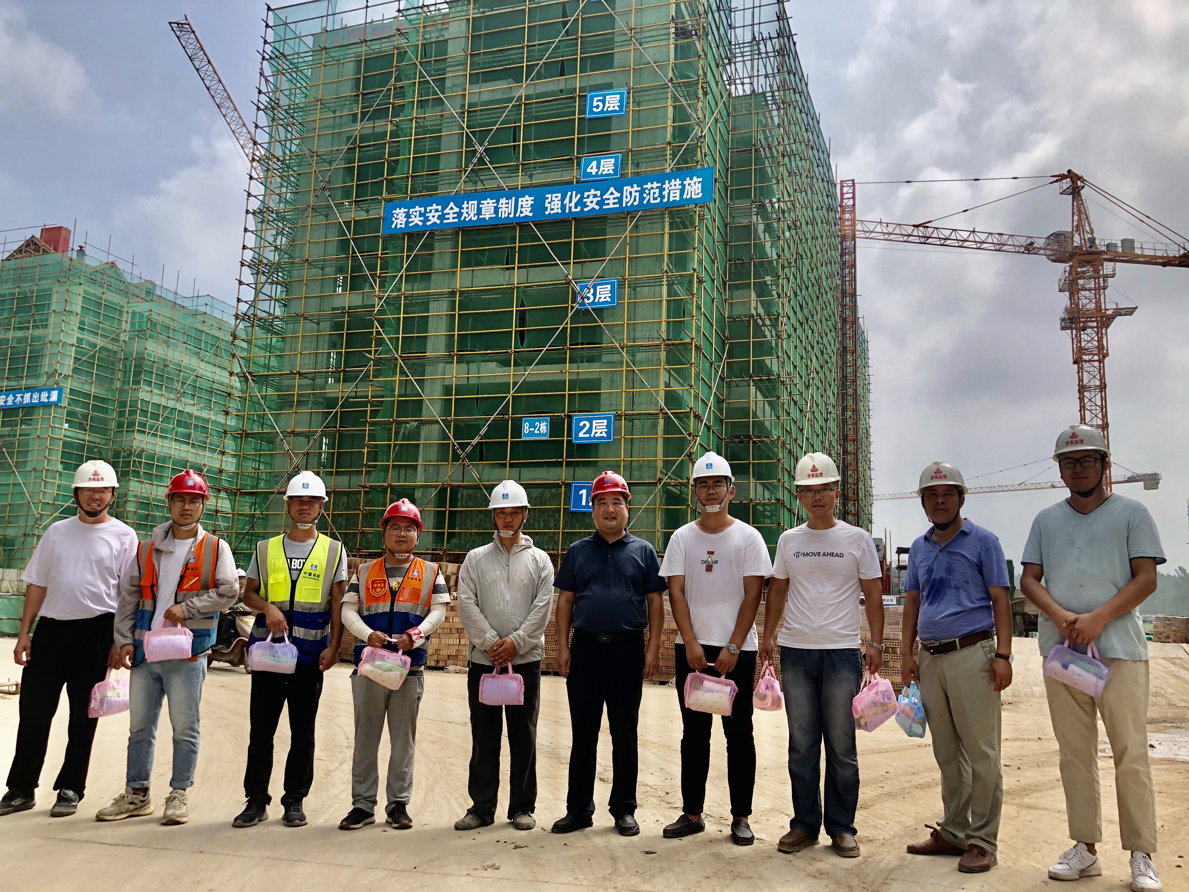 8月11日上午,热浪袭人,房地产党支部副书记童晓强同志带着殷切关怀和慰问品,先后到绿金花园、绿金新城施工现场,慰问一线作业人员,送去防暑降温物品,叮嘱他们在高温天气下作业要保重身体、合理休息,既要完成工作,也要确保身体健康,保质保量地完成施工任务。