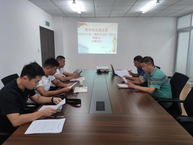 为贯彻落实集团公司下发的《2022年中秋、国庆节点纠“四风”树新风的工作的通知》。建投油品党支部于9月9日上午在交投会议室组织学习了中秋、国庆纠“四风”树新风专题会议,支部副书记张晓兵主持会议并讲话,支部全体党员参加会议。