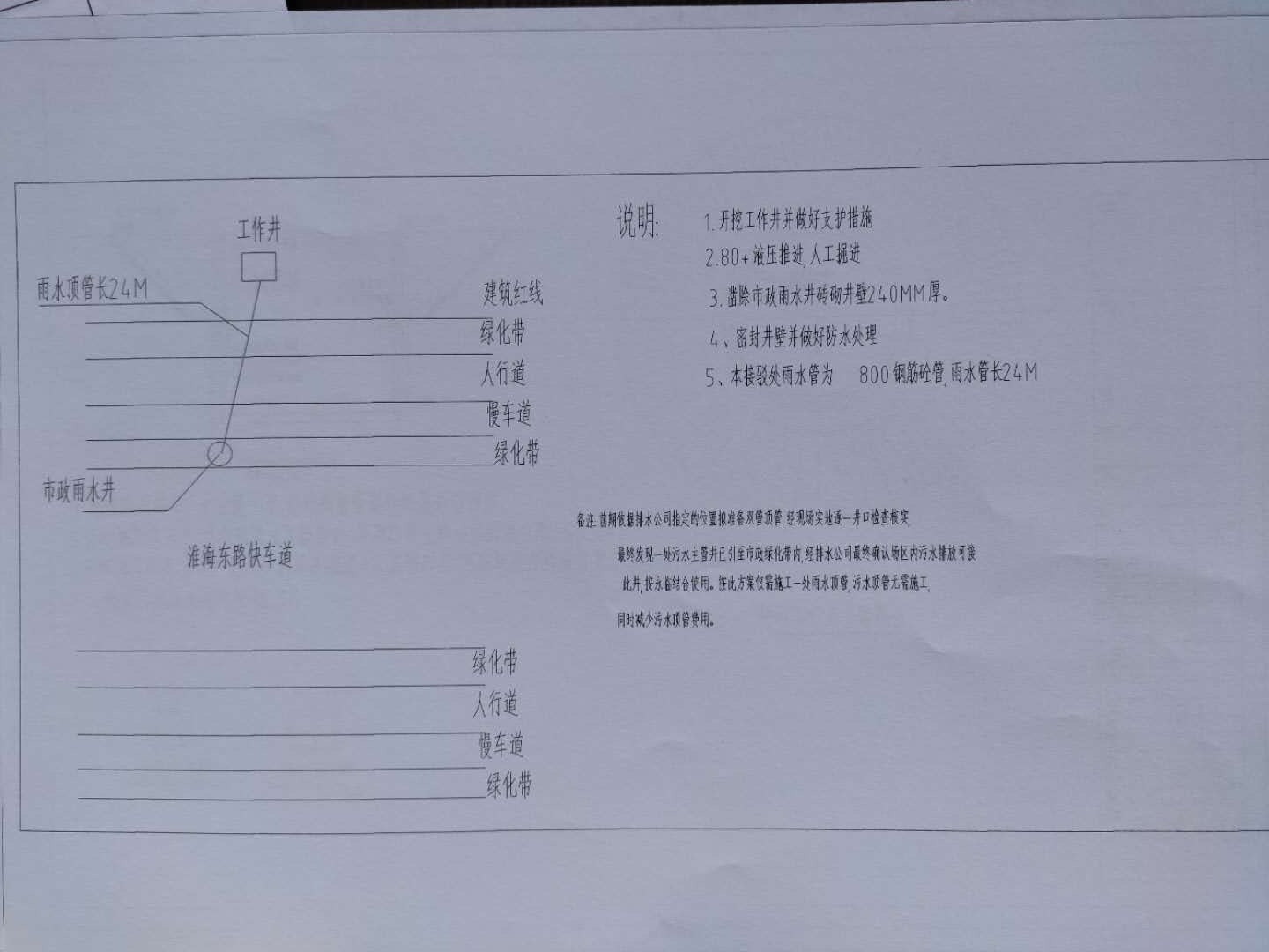 4、本次招标范围:投标人完成招标人红线范围内指定的区域顶管至外线外淮海东路上指定的市政雨水井,保证排水通畅及政府相关部门验收标准,顶管采用直径Φ800钢带涵管,具体详见清单。