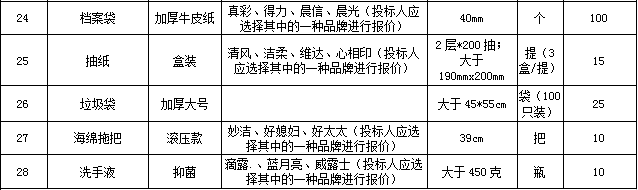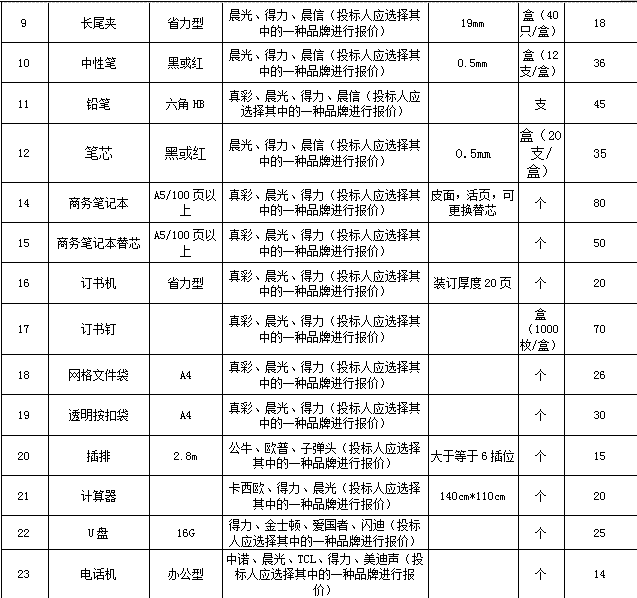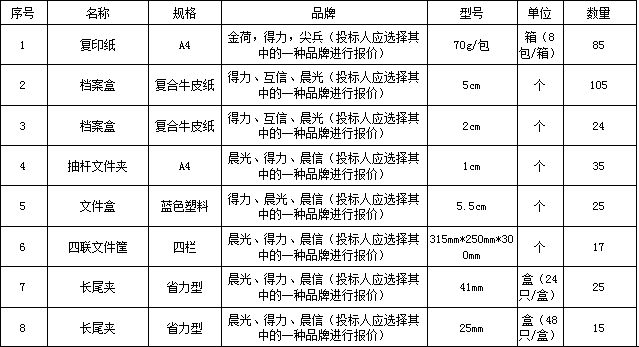 | 招标范围 | 包括但不限于办公用品的生产供货、包装、运输、检测、验收、质保及售后服务等。如有漏项或缺项,投标人承担全部责任。 | |||||||||