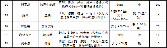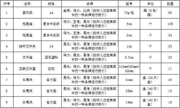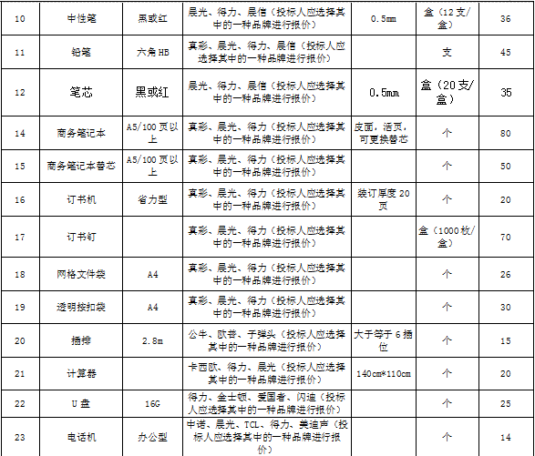 | 招标范围 | 包括但不限于办公用品的生产供货、包装、运输、检测、验收、质保及售后服务等。如有漏项或缺项,投标人承担全部责任。 | ||||||||||||||||
