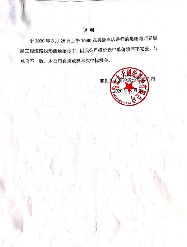 淮北市惠黎路西延道路工程 道路线形测绘询价选聘第一中标候选人放弃中标资格公示