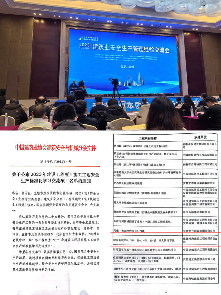 12月15日,由中国建筑业协会建筑安全与机械分会主办的2023年建筑安全生产管理经验交流会在苏州召开,淮海建工公司绿金新城二期工程获评全国建设工程项目施工安全标准化项目。这是该工程在获评淮北市建筑安全生产标准化示范工地、安徽省建筑安全生产标准化示范工地等荣誉后获得的又一殊荣,为目前国家建设部批准的全国范围内建筑安全文明施工领域的高级别奖项。
