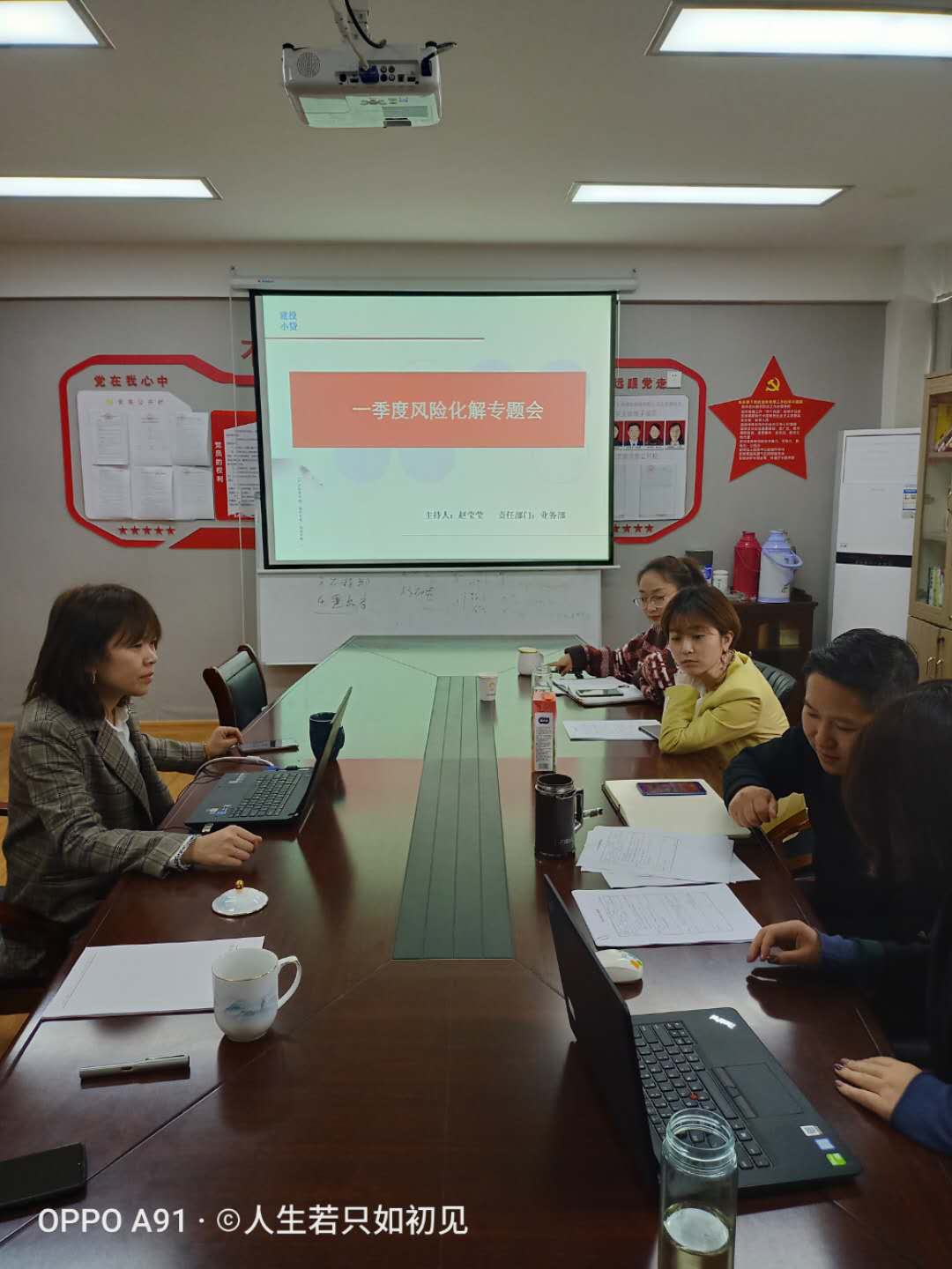 4月9日下午,小贷公司副总经理赵莹莹主持召开2020年一季度业务风险化解专题会,金控风控部部长李贞到会指导,会议听取了业务部关于一季度业务开展情况的汇报;经过讨论,会议制定了风险化解措施,明确主体责任,加大处置力度,降低贷款风险。