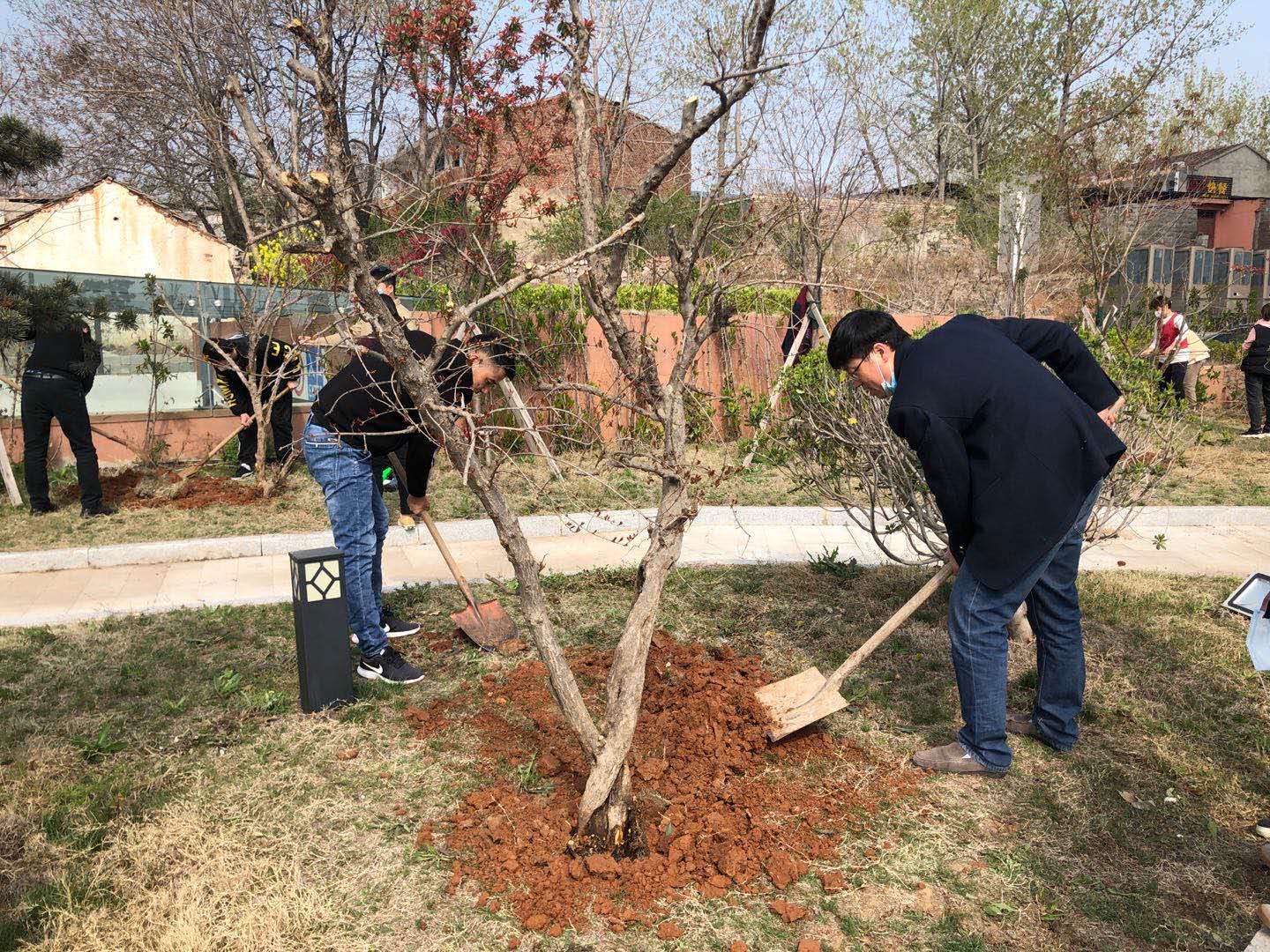 支部副书记张争光对本次活动作出了分工安排,党员同志身先士卒,员工们情绪高昂,大家互相配合,有的挥锹铲土 、有的扶树填土、有的培土浇水,每个都忙的不亦乐乎。