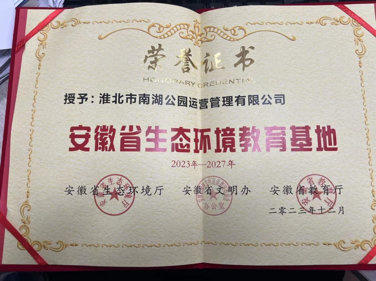根据《安徽省生态环境厅、安徽省文明办、安徽省教育厅关于开展“安徽省生态环境教育基地”评选工作的通知》( 皖环函[2023]852号)要求,经各市推荐、资格审核、现场评估、公示等程序,安徽省生态环境厅、安徽省文明办、安徽省教育厅决定命名安徽庐阳董铺国家湿地公园等 19 家单位为“安徽省生态环境教育基地”,南湖公园作为淮北市唯一一家入选“安徽省生态环境教育基地”。