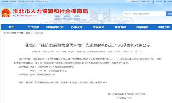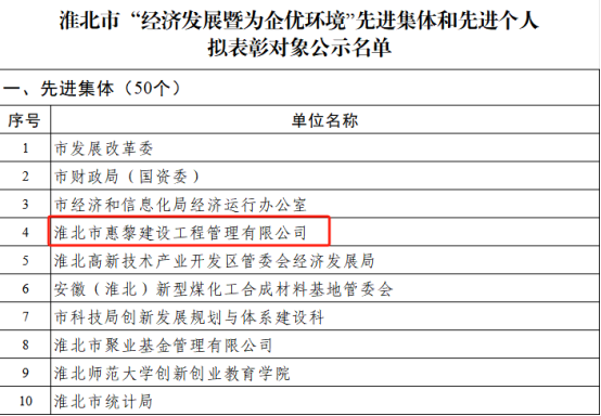 近日,由淮北市评选表彰工作领导小组办公室(淮北市人力资源社会保障局)组织对2023年度淮北市“经济发展暨为企优环境”先进集体和先进个人进行了表彰,淮北市惠黎建设工程管理有限公司荣登“先进集体”荣誉榜头部。