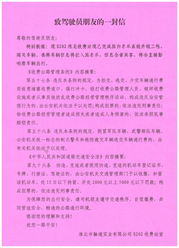 为进一步整治收费站冲卡、闯卡现象,融通公司S202收费站结合工作实际,印发《致驾驶员朋友的一封信》,大力宣传收费站黑白名单系统升级工程,将闯关车辆及套牌车辆拉入收费站系统黑名单,并全面解读《收费站公路管理条例》《中华人民共和国道路交通安全法》相关法律法规。