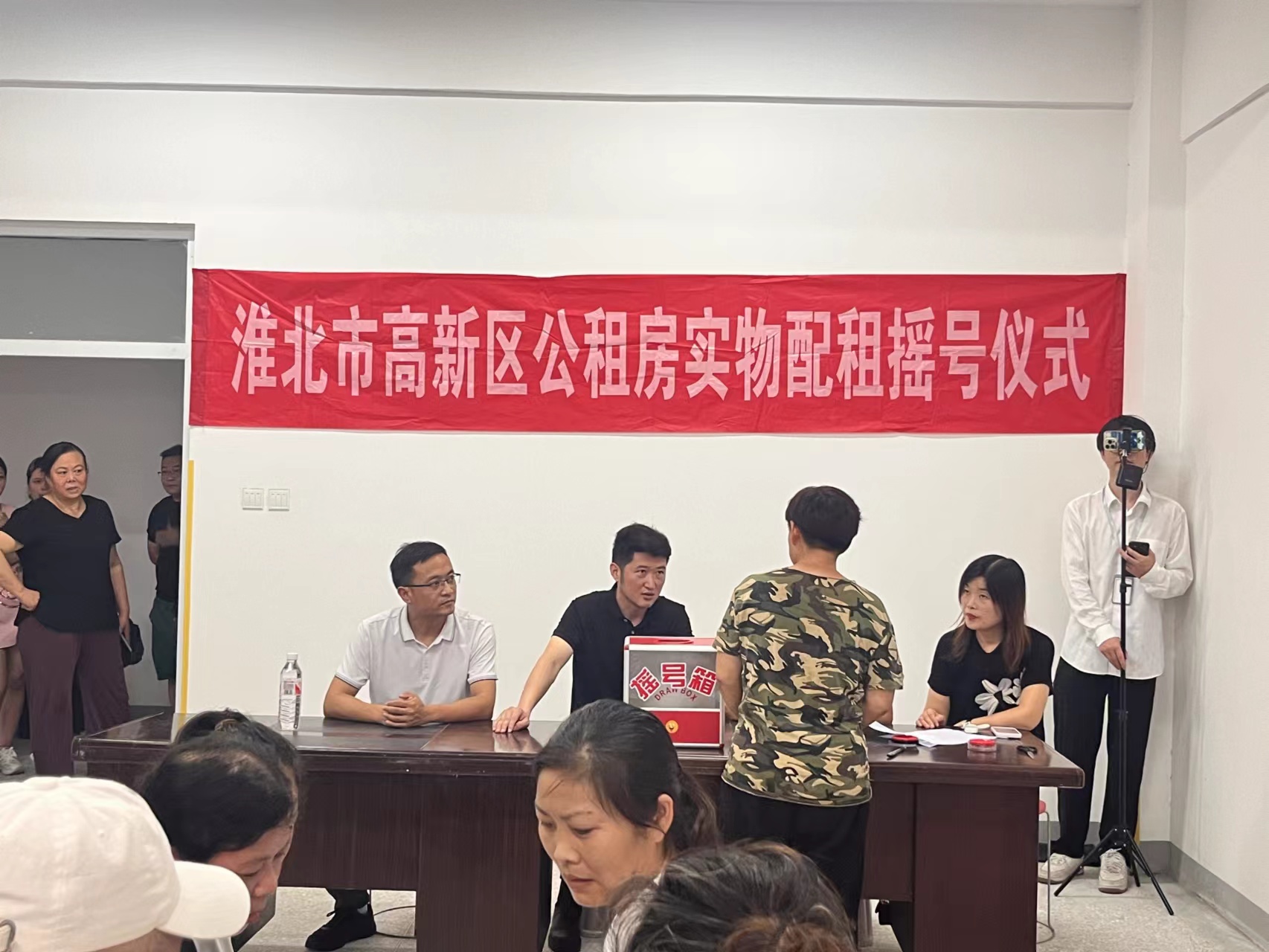 2024年7月17日,淮北市高新区公租房实物配租公开摇号仪式在龙湖新村小区举行,通过本次公租房实物配租,37户园区住房困难职工家庭圆住房梦。市高新区国土规划局、保障房公司及建投物业相关负责人参加活动。