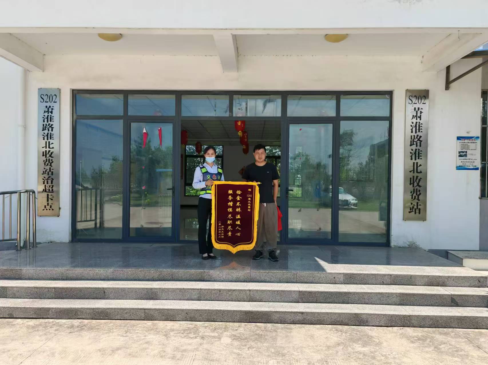 “真的谢谢你们,没接到你们电话之前,我已经和家里的人找了好久了,一直不知道掉哪里了。感谢你们拾金不昧、乐于助人,送上小小锦旗,聊表谢意!”7月25日,在S202淮北收费站,失主孙先生送上锦旗一个劲地向工作人员道谢。