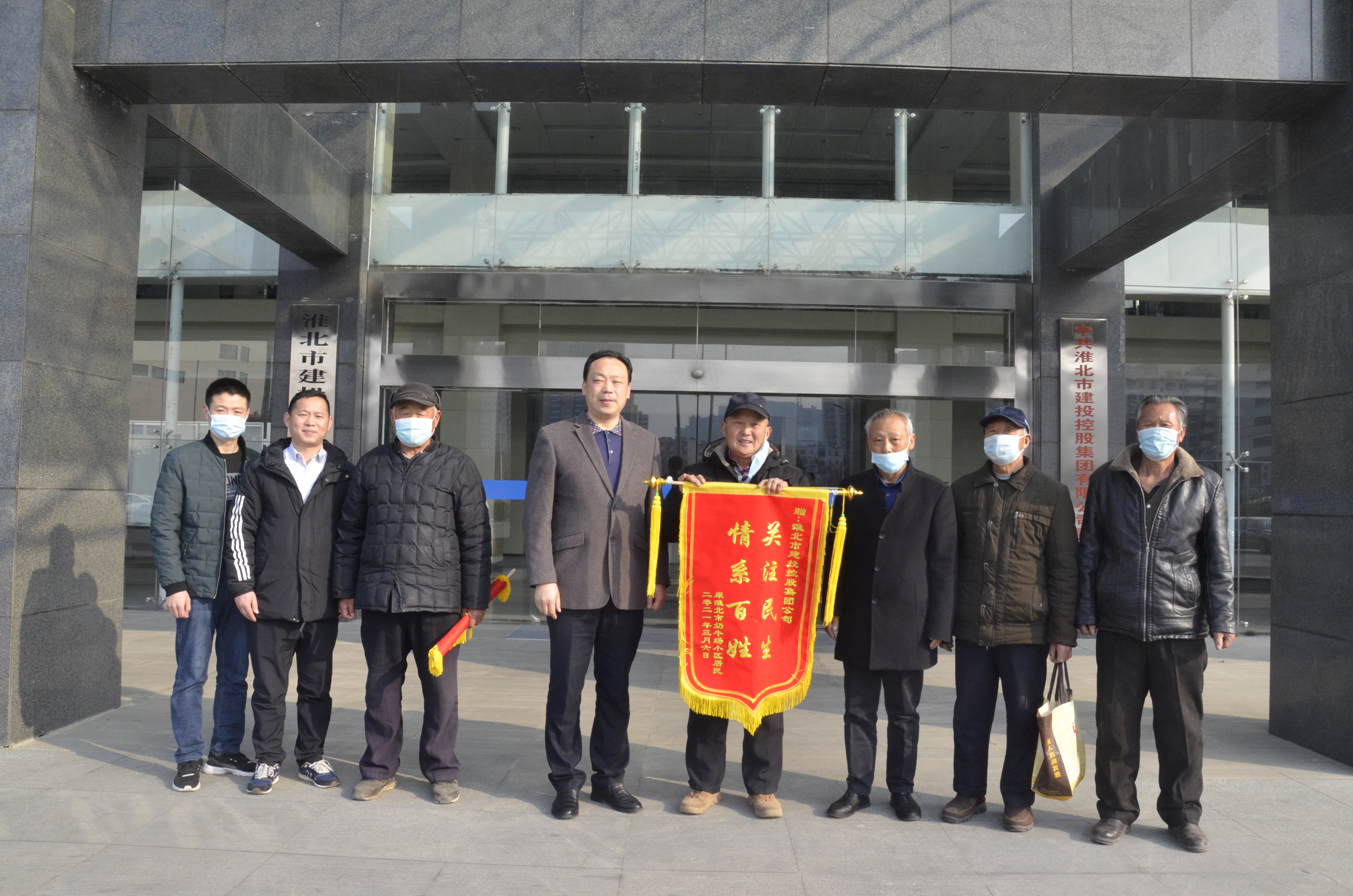 3月8日上午,原淮北奶牛场退休职工刘德亮、倪永林一行五人,怀着一颗感谢的心,来到集团公司送上一面写有“情系百姓·关注民生”的锦旗,感谢市建投集团公司为原淮北市奶牛场居住区居民解决生活饮水问题。