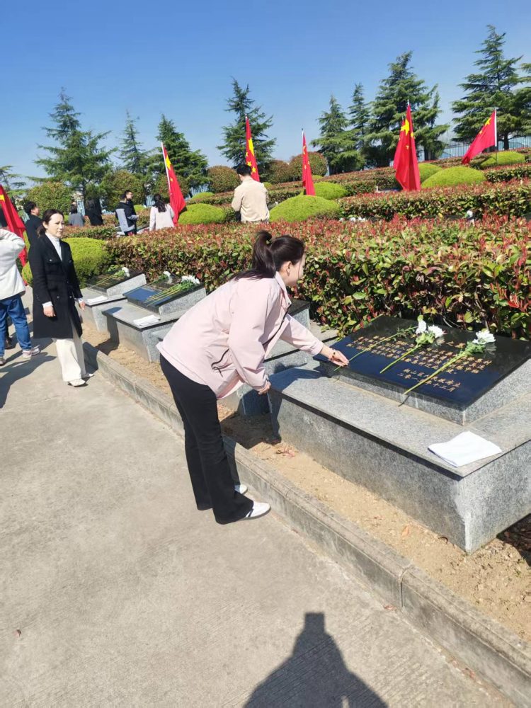 活动伊始,全体党员整齐列队,怀着崇敬之情向革命烈士敬献花篮,寄托着对先烈们的无限哀思与崇高敬意。随后,在鲜红的党旗前,全体党员庄严地举起右拳,重温入党誓词。铿锵有力的誓言在陵园上空回荡,彰显了党员们不忘初心、牢记使命的政治信念。最后,党员们有序参观了陵园内的纪念碑,支部书记杨旸同志带领支部党员纷纷向英雄先烈们献上鲜花。