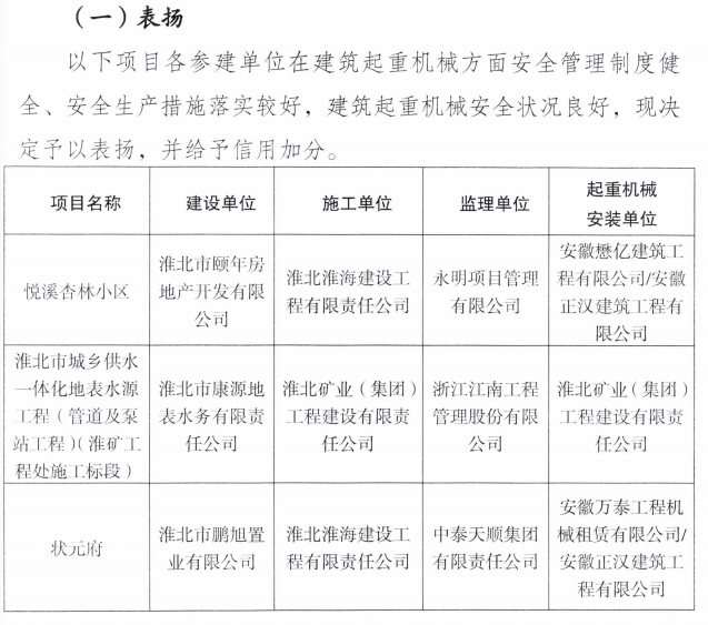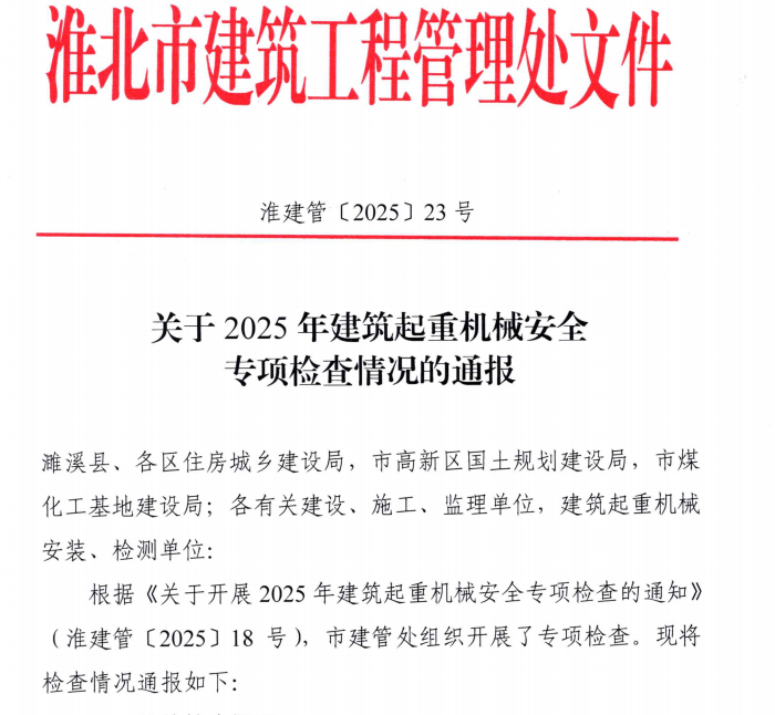 2025年7月21日,淮北市建筑工程管理处发布了2025年建筑起重机械安全专项检查情况通报,淮海建工公司承建的悦溪杏林小区、状元府两个项目在安全管理制度健全、安全生产措施落实及建筑起重机械安全状况良好等方面表现突出,获得市建管处通报表扬的同时也为公司赢得了信用加分!