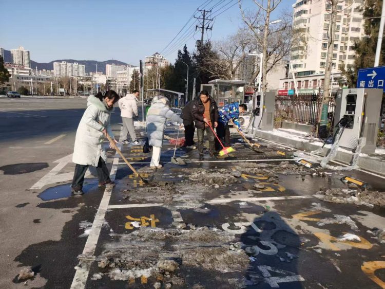 活动现场,党员们携带铁锹、扫帚等工具,分工协作。大家不顾严寒,弯腰挥铲、奋力清扫,重点清理充电站出入口、充电车位及周边通道的积雪与薄冰。数小时奋战后,充电站内外积雪全部清理完毕,为市民营造了安全、畅通、便捷的充电环境。
