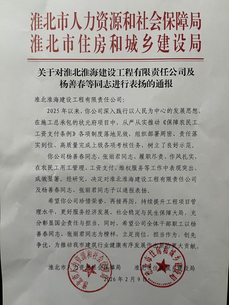 淮海建工公司深入践行以人民为中心的发展思想,严格执行《保障农民工工资支付条例》等各项制度,将农民工工资支付工作作为节前重中之重。面对公司资金压力较大的现状,公司领导统筹调度资金、落实压实责任。采取“特事特办、温暖感化”等措施,优先保障农民工工资支付和工程款兑付,切实化解信访隐患,彰显国企责任与担当。公司状元府项目杨善春、张丽君同志表现突出,受到淮北市人力资源和社会保障局、淮北市住房和城乡建设局的通报表扬。他们以实际行动守护农民工的“钱袋子”,让广大工友能够安“薪”返乡、温暖过年。
