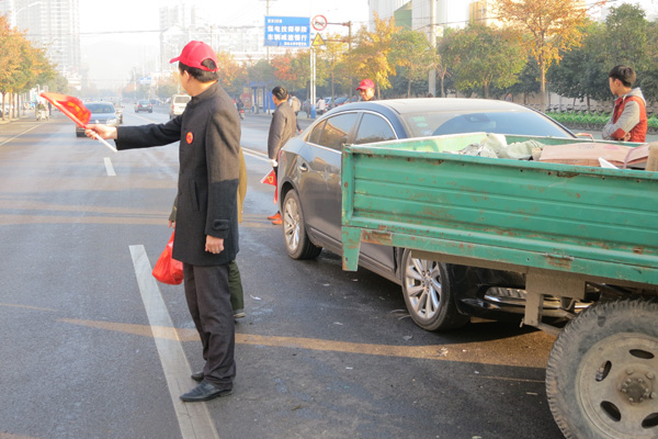 活动现场,志愿者们头戴志愿者服务帽,手拿文明劝导小红旗,协助交警维护交通秩序,处理突发交通事故,积极帮助寻找走失亲人的外地老乡联系电台、救助站……在活动过程中,尽管气温很低,但是志愿者们对老弱残者或路人都会提供热情的帮助,为他们排忧解难。