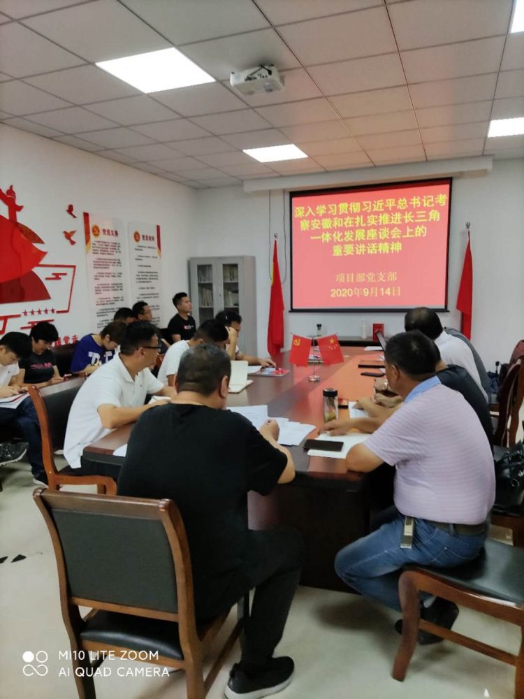 9月14日上午,淮海建工公司项目部党支部在公司二楼党员活动室召开支部大会,传达学习习近平总书记视察安徽、在扎实推进长三角一体化发展座谈会上的重要讲话精神,支部全体党员参加了会议。