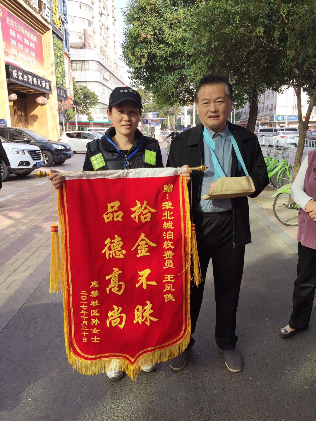 导语:10月31日上午,失主王乃志向淮北城市泊车管理有限公司收费员王凤侠赠送锦旗,衷心感谢!收费员王凤侠拾金不昧,我被这位普通的收费员高尚的品质深深感动。