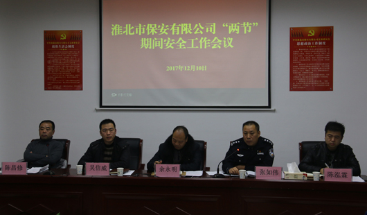 2017年12月10日晚,淮北市保安有限公司在六楼会议室召开“两节”期间安全工作会议和讲服务、转作风专项整顿活动启动仪式,公司领导班子成员及市监管支队政委张如伟同志出席会议。