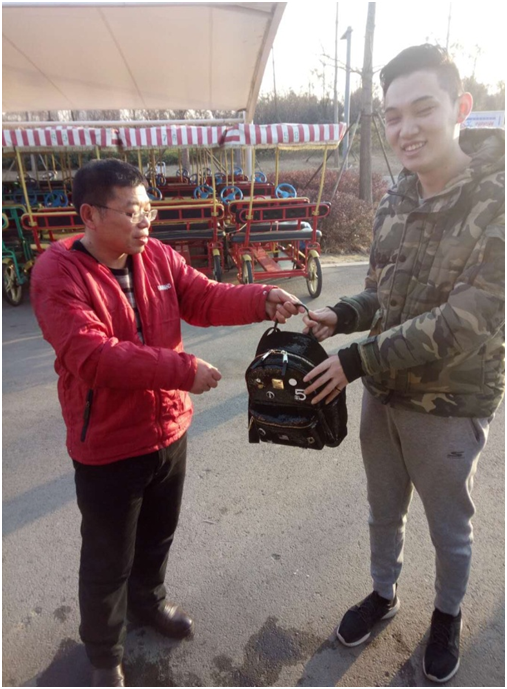 12月21日下午3点半,一位来自河南的游客在乘坐南湖景区观光车游览时,不慎将随身携带的背包遗忘,被南湖景区电瓶车班长朱德标及时发现,并通过身份证上的信息物归原主。失主对朱德标这种拾金不昧精神和急游客所急的服务态度感到万分感谢,激动地说:“非常感谢,要是没有钱包和证件我此后的行程会有很大影响,南湖人真是好!”。