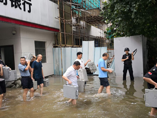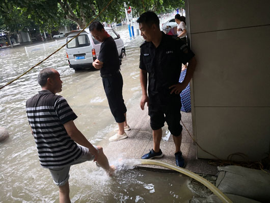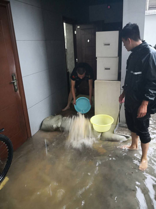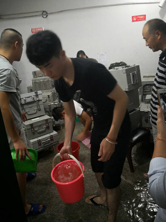19日清晨,由于雨势较大,加之街道排水不畅,濉溪农商银行金库进水被浸泡。淮北市保安有限公司押运三中队队员与银行金库人员坚守在第一线,迅速展开自救,用事先准备好的沙袋将联动门围裹后,用水泵、水盆等工具将积水外排。