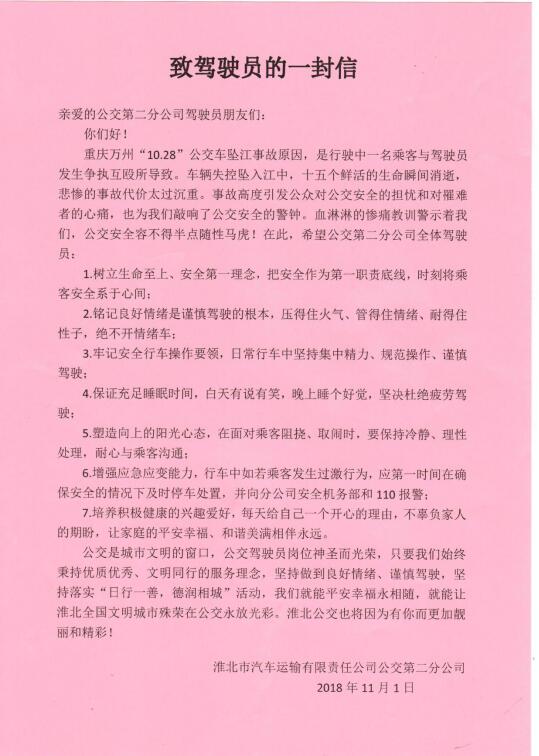 公交是城市文明的窗口,公交驾驶员岗位神圣而光荣,只要我们始终秉持优质优秀、文明同行的服务理念,坚持做到良好情绪、谨慎驾驶,坚持落实“日行一善,德润相城”活动,我们就能平安幸福永相随,就能让淮北全国文明城市殊荣在公交永放光彩。淮北公交也将因为有你而更加靓丽和精彩!