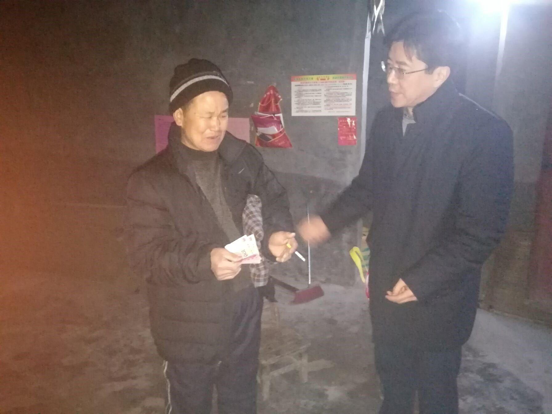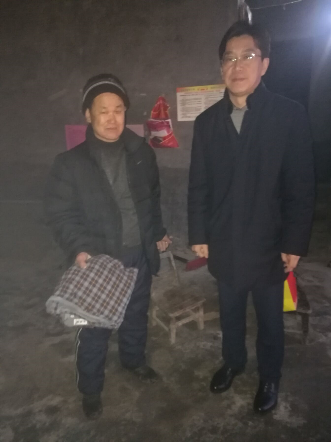 王献忠同志与村民朱良超一户促膝交谈,关心村民家的生产生活状况,鼓励他们要照顾好自己的生活,坚定脱贫致富的决心,并亲手送上慰问金、衣物、春联,希望他们过一个祥和的春节。