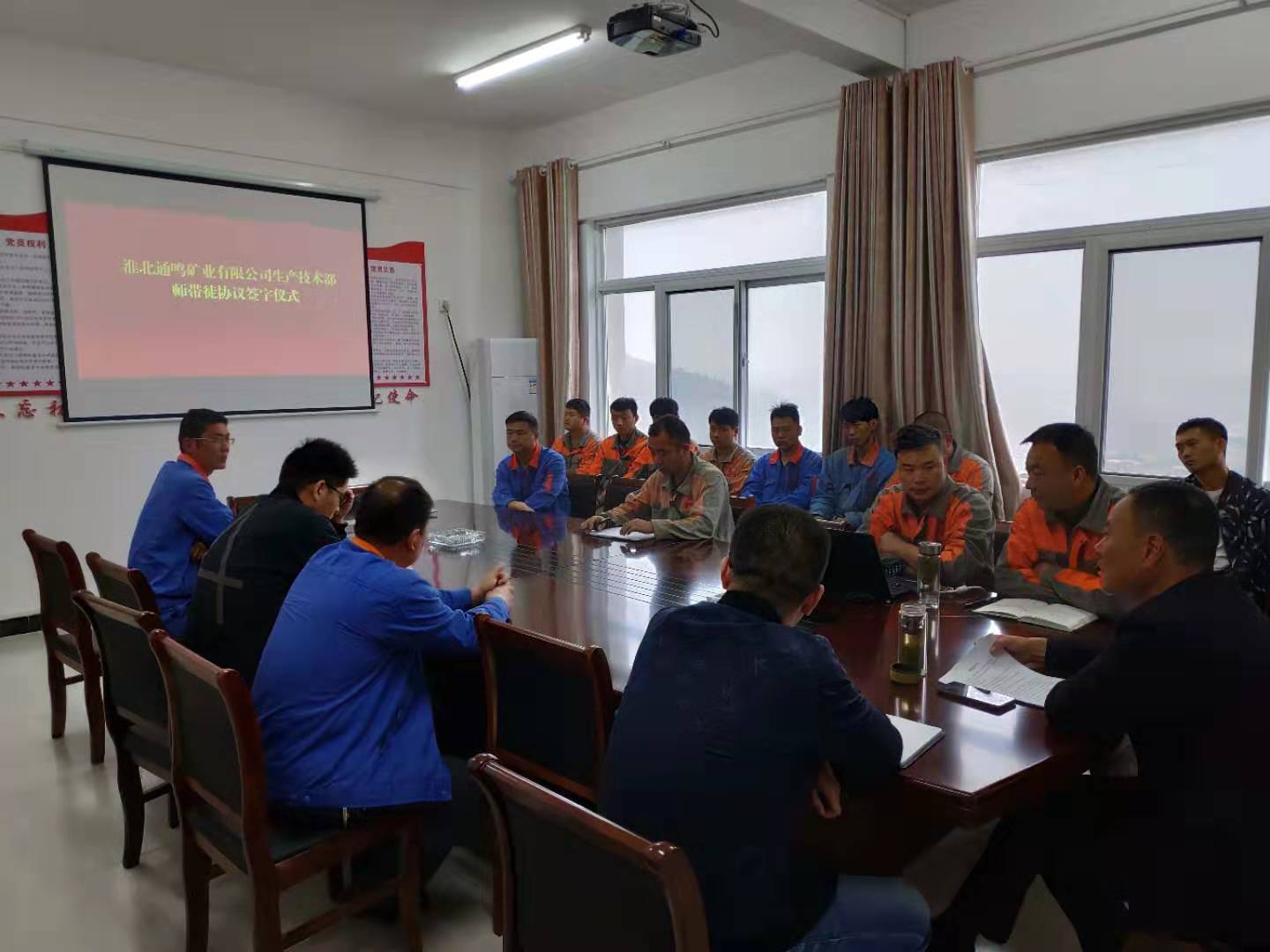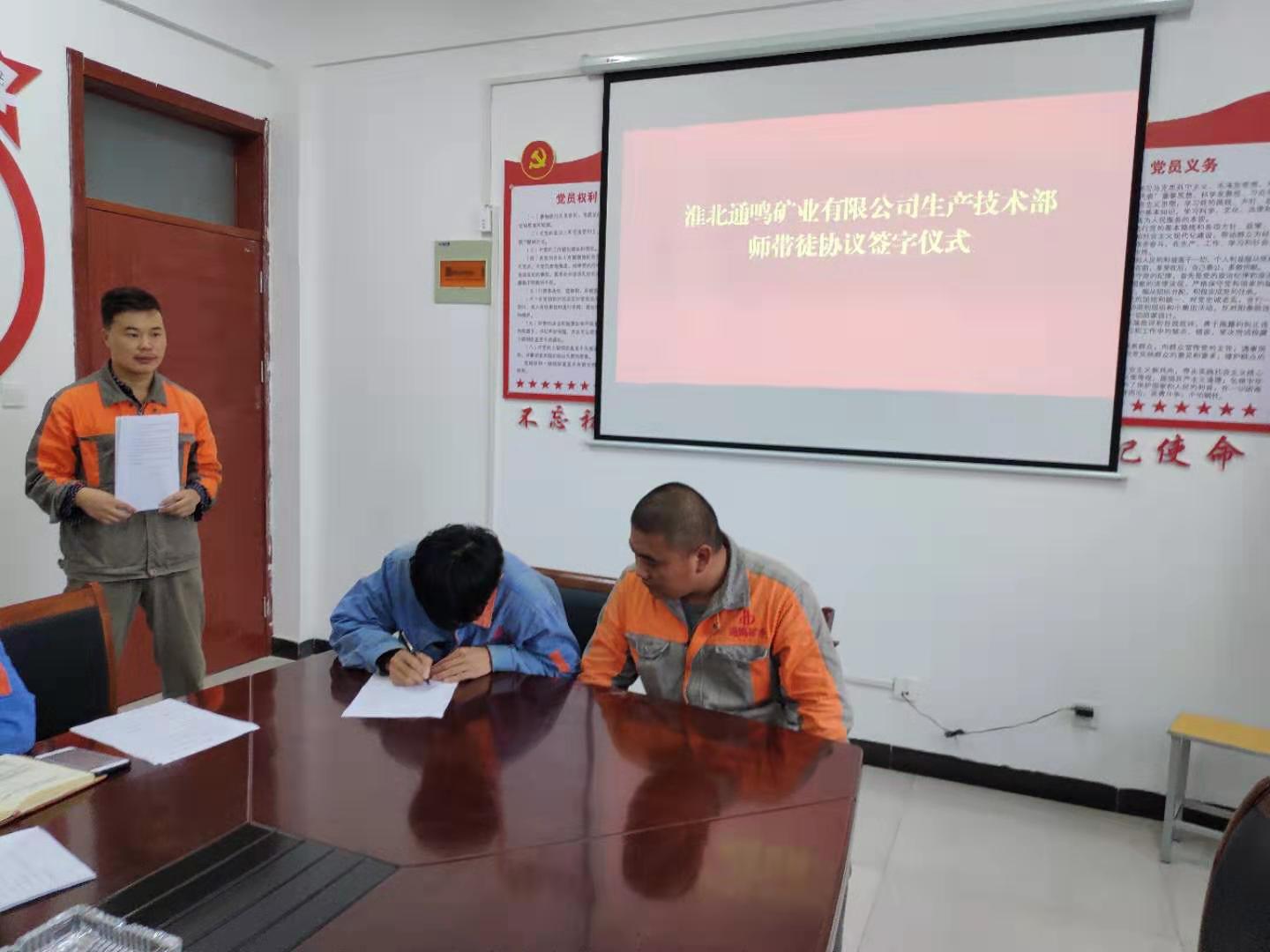 为提高通鸣矿业员工专业技术水平和业务技能,发挥骨干员工在技术和经验方面的优势,2019年10月10日上午10时,通鸣矿业总经理程南华、副总经理张震、毛鸿显及各部门负责人、生产技术部机电维修班全体员工在通鸣矿业三楼会议室开展师带徒活动。