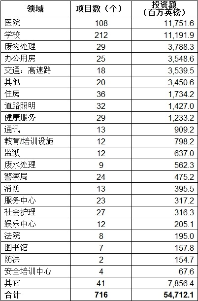 截至2012年3月,在PFI下共有717个项目,总投资547亿英镑。其中,648个处于运行阶段。具体情况见附表。
