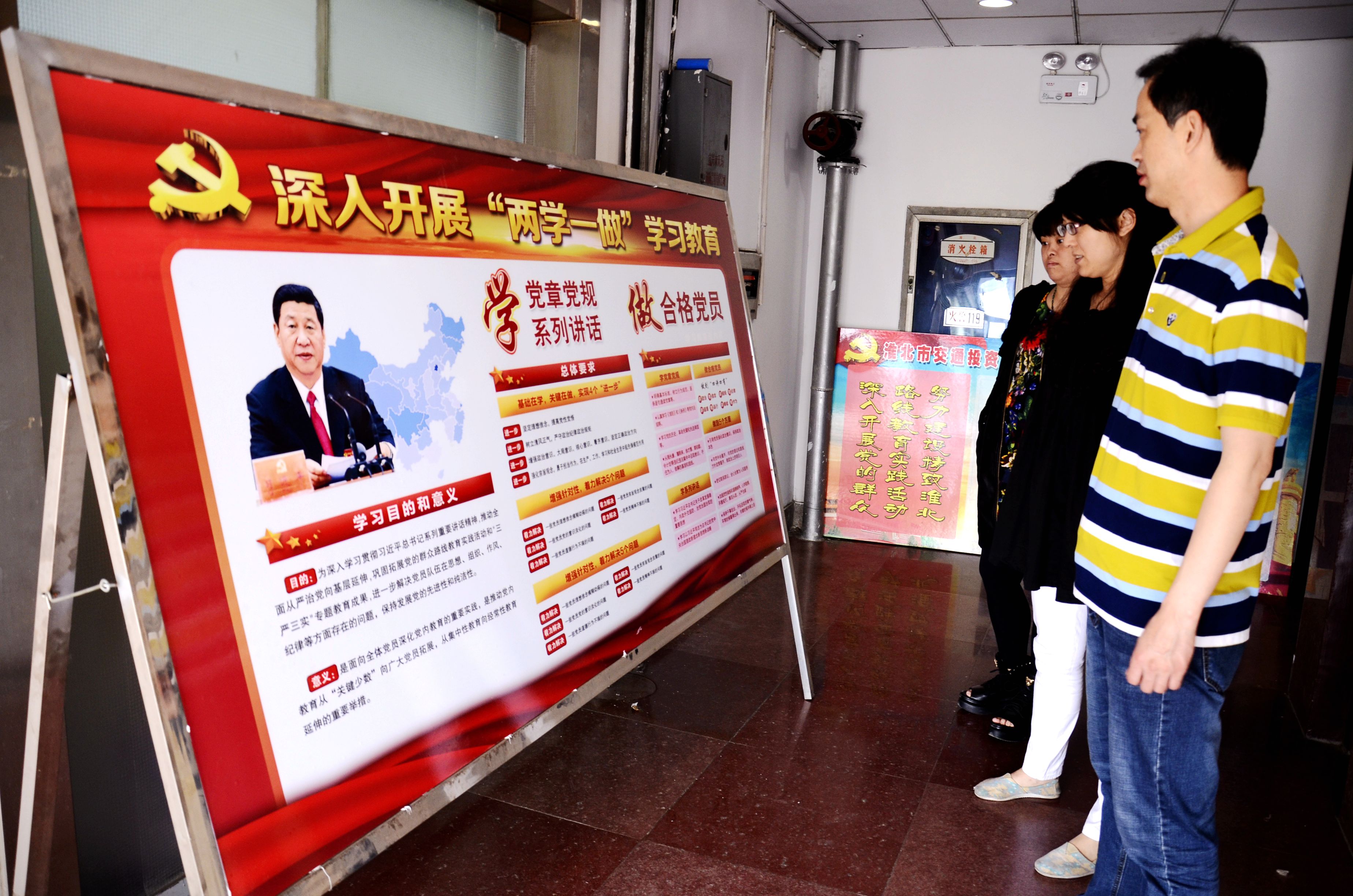 图为同创集团、交投公司、保安公司的 员工在观看 两学一做学习教育展板。