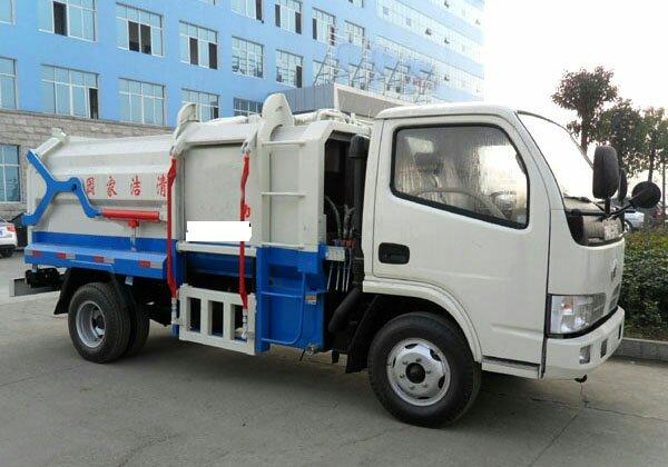 b.车上配置:有效装载容积5立方,箱体采用边三底四碳钢板制作,箱体前部侧面带有挂桶提升机构,可自动举升垃圾桶倒入垃圾,带自卸功能,尾部装有橡胶密封条,防污水滴漏。